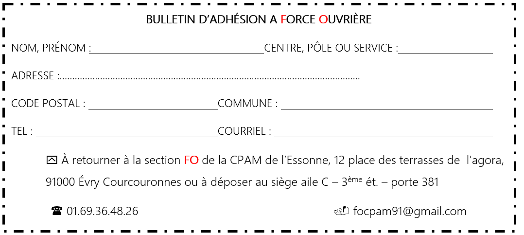 Si tu veux prendre ta carte à FO, n’hésite pas ! Personne ne pourra le savoir, ni ton encadrement, ni la direction, ni même tes collègues, à moins que toi, tu décides d’en parler ou de venir militer. Rien ne t’oblige à en parler ou à militer, tu peux soutenir ton syndicat discrètement, c’est aussi très important et tout ça est déductible des impôts à hauteur de 66%.